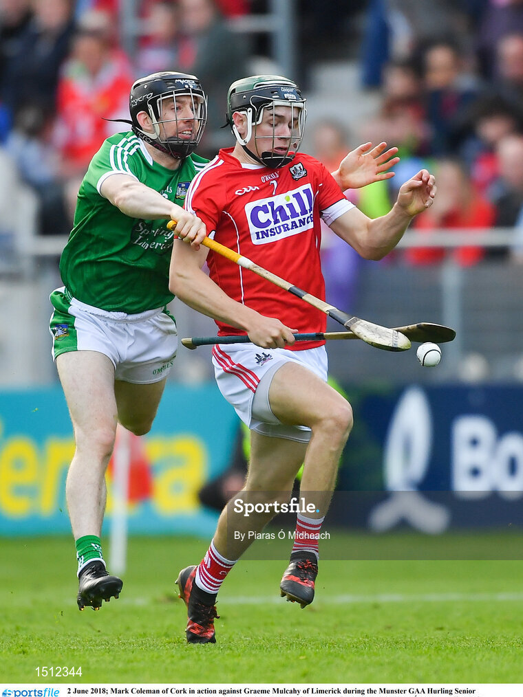 2 June 2018; Mark Coleman of Cork in action against Graeme Mulcahy of Limerick during the Munster GAA Hurling Senior Championship Round 3 match between Cork and Limerick at Páirc Uí Chaoimh in Cork. Photo by Piaras Ó Mídheach/Sportsfile