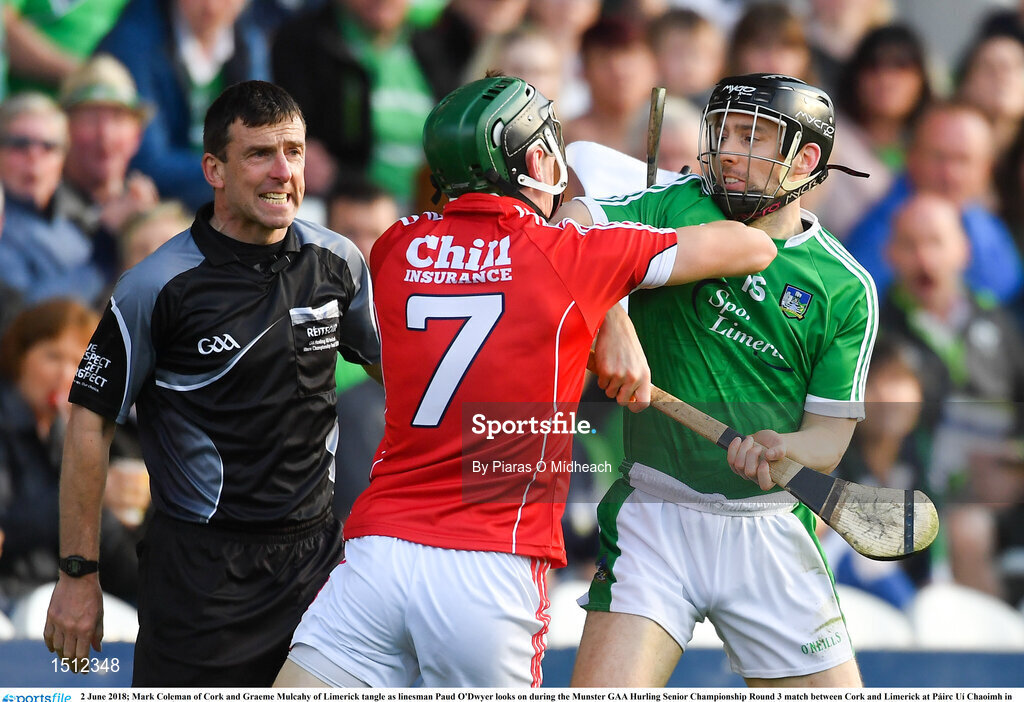 2 June 2018; Mark Coleman of Cork and Graeme Mulcahy of Limerick tussle as linesman Paud O'Dwyer looks on during the Munster GAA Hurling Senior Championship Round 3 match between Cork and Limerick at Páirc Uí Chaoimh in Cork. Photo by Piaras Ó Mídheach/Sportsfile