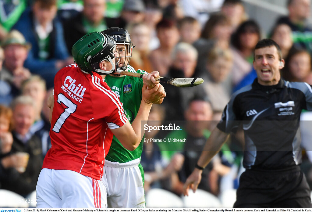2 June 2018; Mark Coleman of Cork and Graeme Mulcahy of Limerick tussle as linesman Paud O'Dwyer looks on during the Munster GAA Hurling Senior Championship Round 3 match between Cork and Limerick at Páirc Uí Chaoimh in Cork. Photo by Piaras Ó Mídheach/Sportsfile