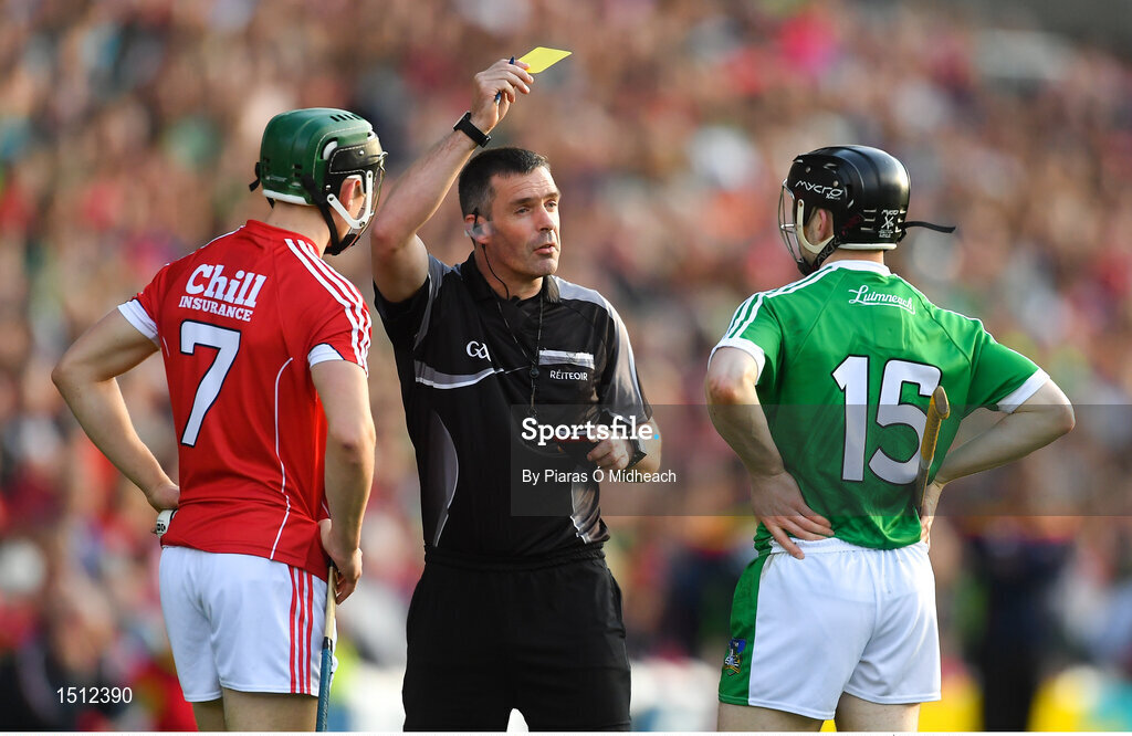 2 June 2018; Referee James Owens issues the yellow card to Mark Coleman of Cork and Graeme Mulcahy of Limerick during the Munster GAA Hurling Senior Championship Round 3 match between Cork and Limerick at Páirc Uí Chaoimh in Cork. Photo by Piaras Ó Mídheach/Sportsfile