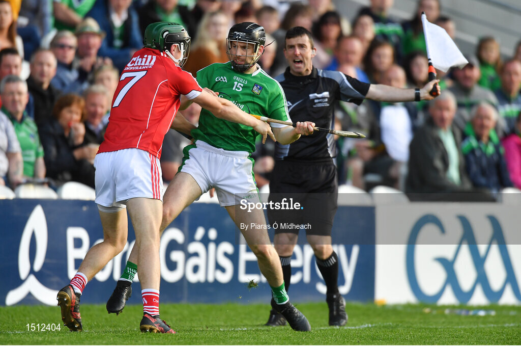2 June 2018; Mark Coleman of Cork and Graeme Mulcahy of Limerick tussle as linesman Paud O'Dwyer looks on during the Munster GAA Hurling Senior Championship Round 3 match between Cork and Limerick at Páirc Uí Chaoimh in Cork. Photo by Piaras Ó Mídheach/Sportsfile