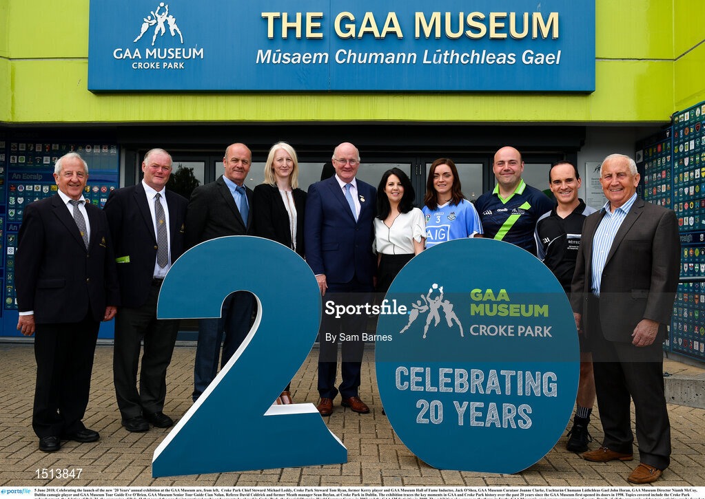 5 June 2018; Celebrating the launch of the new ’20 Years’ annual exhibition at the GAA Museum are, from left, Croke Park Chief Steward Michael Leddy, Croke Park Steward Tom Ryan, former Kerry player and GAA Museum Hall of Fame Inductee, Jack O'Shea, GAA Museum Curataor Joanne Clarke, Uachtarán Chumann Lúthchleas Gael John Horan, GAA Museum Director Niamh McCoy, Dublin camogie player and GAA Museum Tour Guide Eve O'Brien, GAA Museum Senior Tour Guide Cian Nolan, Referee David Coldrick and former Meath manager Sean Boylan, at Croke Park in Dublin. The exhibition traces the key moments in GAA and Croke Park history over the past 20 years since the GAA Museum first opened its doors in 1998. Topics covered include the Croke Park redevelopment, the deletion of Rule 21, the suspension of Rule 42 that paved the way for international rugby and soccer to be played in Croke Park, the Special Olympics World Summer Games in 2003 and the GAA 125 festivities in 2009. The exhibition also serves as the throw-in for the GAA Museum’s anniversary programme of events. Details of all the museum’s celebratory activities can be found at www.crokepark.ie/gaamuseum. Photo by Sam Barnes/Sportsfile