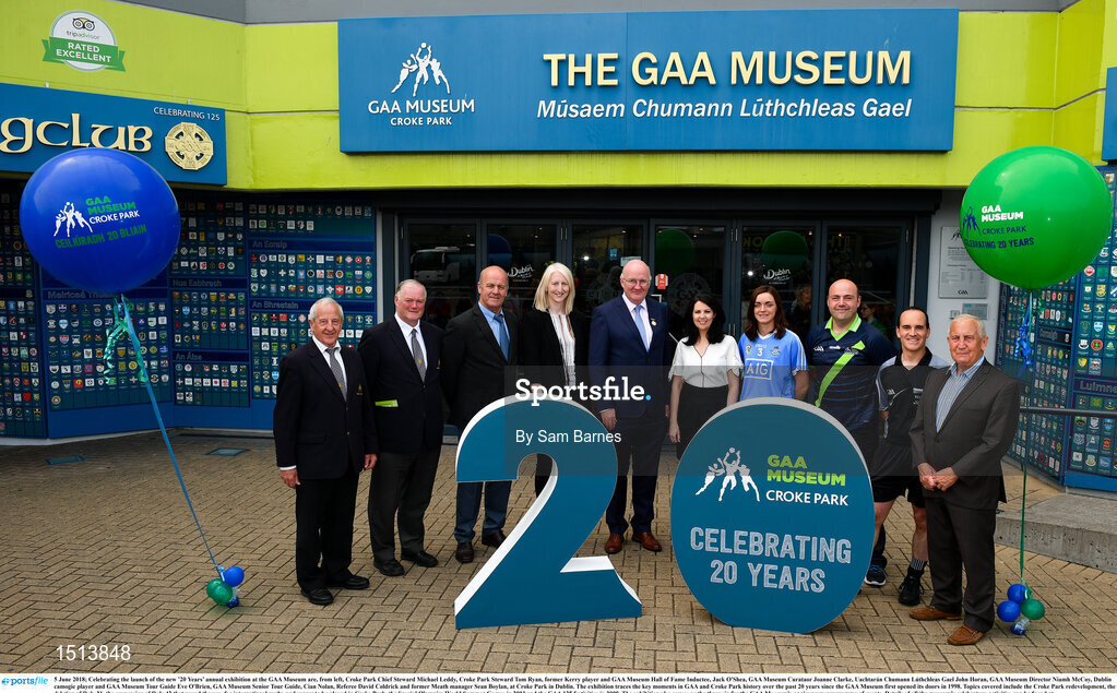 5 June 2018; Celebrating the launch of the new ’20 Years’ annual exhibition at the GAA Museum are, from left, Croke Park Chief Steward Michael Leddy, Croke Park Steward Tom Ryan, former Kerry player and GAA Museum Hall of Fame Inductee, Jack O'Shea, GAA Museum Curataor Joanne Clarke, Uachtarán Chumann Lúthchleas Gael John Horan, GAA Museum Director Niamh McCoy, Dublin camogie player and GAA Museum Tour Guide Eve O'Brien, GAA Museum Senior Tour Guide, Cian Nolan, Referee David Coldrick and former Meath manager Sean Boylan, at Croke Park in Dublin. The exhibition traces the key moments in GAA and Croke Park history over the past 20 years since the GAA Museum first opened its doors in 1998. Topics covered include the Croke Park redevelopment, the deletion of Rule 21, the suspension of Rule 42 that paved the way for international rugby and soccer to be played in Croke Park, the Special Olympics World Summer Games in 2003 and the GAA 125 festivities in 2009. The exhibition also serves as the throw-in for the GAA Museum’s anniversary programme of events. Details of all the museum’s celebratory activities can be found at www.crokepark.ie/gaamuseum. Photo by Sam Barnes/Sportsfile