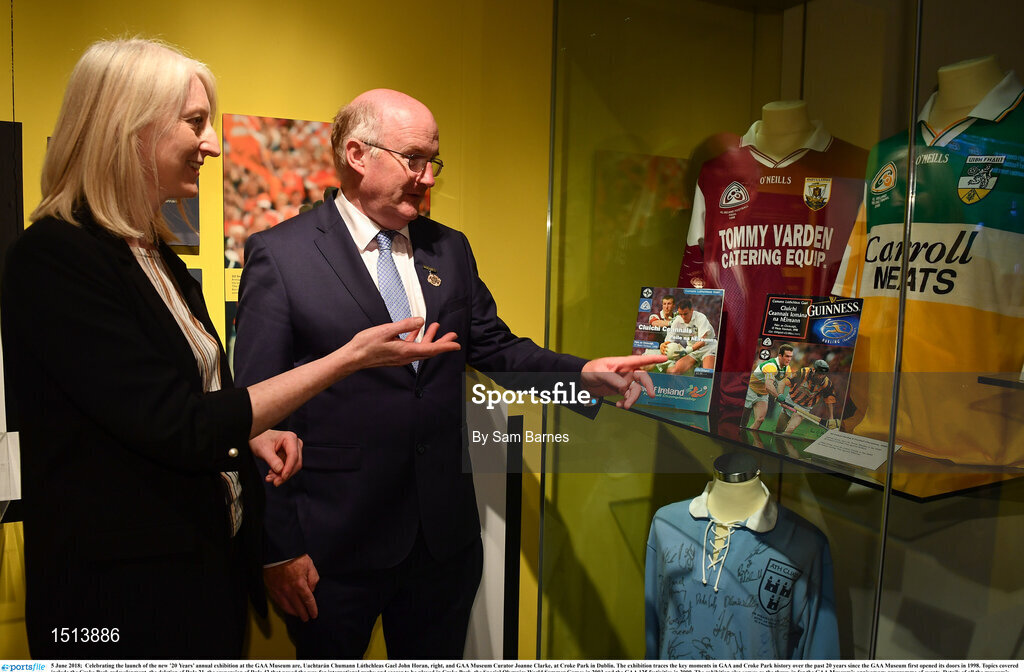 5 June 2018; Celebrating the launch of the new ’20 Years’ annual exhibition at the GAA Museum are, Uachtarán Chumann Lúthchleas Gael John Horan, right, and GAA Museum Curator Joanne Clarke, at Croke Park in Dublin. The exhibition traces the key moments in GAA and Croke Park history over the past 20 years since the GAA Museum first opened its doors in 1998. Topics covered include the Croke Park redevelopment, the deletion of Rule 21, the suspension of Rule 42 that paved the way for international rugby and soccer to be played in Croke Park, the Special Olympics World Summer Games in 2003 and the GAA 125 festivities in 2009. The exhibition also serves as the throw-in for the GAA Museum’s anniversary programme of events. Details of all the museum’s celebratory activities can be found at www.crokepark.ie/gaamuseum. Photo by Sam Barnes/Sportsfile