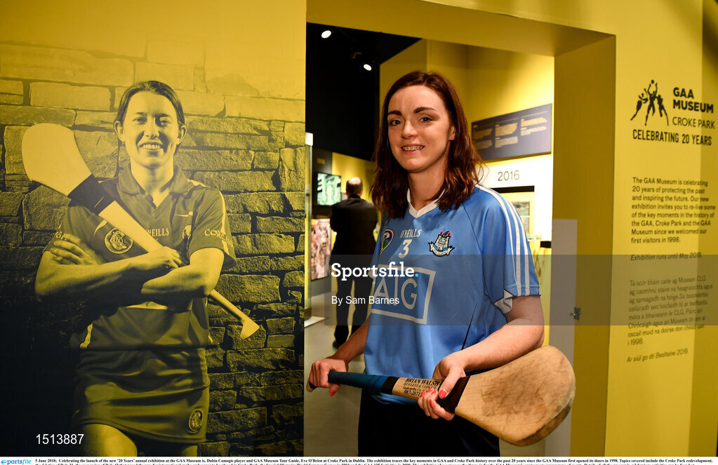 5 June 2018; Celebrating the launch of the new ’20 Years’ annual exhibition at the GAA Museum is, Dubin Camogie player and GAA Museum Tour Guide, Eve O'Brien at Croke Park in Dublin. The exhibition traces the key moments in GAA and Croke Park history over the past 20 years since the GAA Museum first opened its doors in 1998. Topics covered include the Croke Park redevelopment, the deletion of Rule 21, the suspension of Rule 42 that paved the way for international rugby and soccer to be played in Croke Park, the Special Olympics World Summer Games in 2003 and the GAA 125 festivities in 2009. The exhibition also serves as the throw-in for the GAA Museum’s anniversary programme of events. Details of all the museum’s celebratory activities can be found at www.crokepark.ie/gaamuseum. Photo by Sam Barnes/Sportsfile