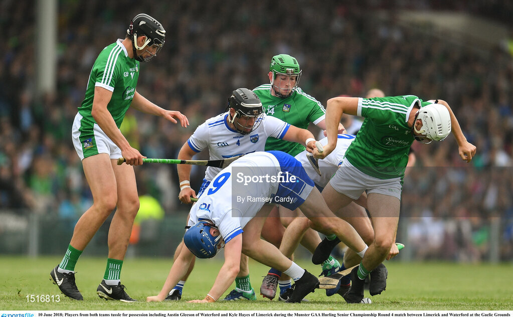 10 June 2018; Players from both teams tussle for possession including Austin Gleeson of Waterford and Kyle Hayes of Limerick during the Munster GAA Hurling Senior Championship Round 4 match between Limerick and Waterford at the Gaelic Grounds in Limerick. Photo by Ramsey Cardy/Sportsfile