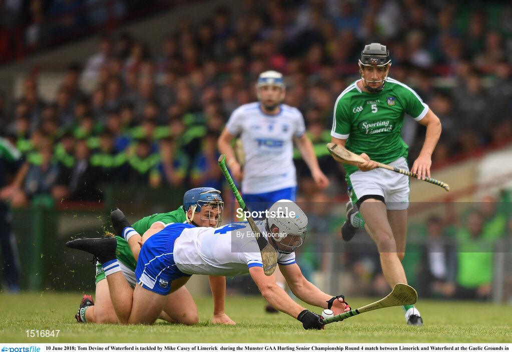 10 June 2018; Tom Devine of Waterford is tackled by Mike Casey of Limerick during the Munster GAA Hurling Senior Championship Round 4 match between Limerick and Waterford at the Gaelic Grounds in Limerick. Photo by Eóin Noonan/Sportsfile