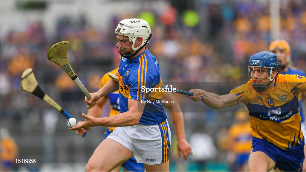 10 June 2018; Brendan Maher of Tipperary in action against Shane O'Donnell of Clare during the Munster GAA Hurling Senior Championship Round 4 match between Tipperary and Clare at Semple Stadium in Thurles, Tipperary. Photo by Ray McManus/Sportsfile