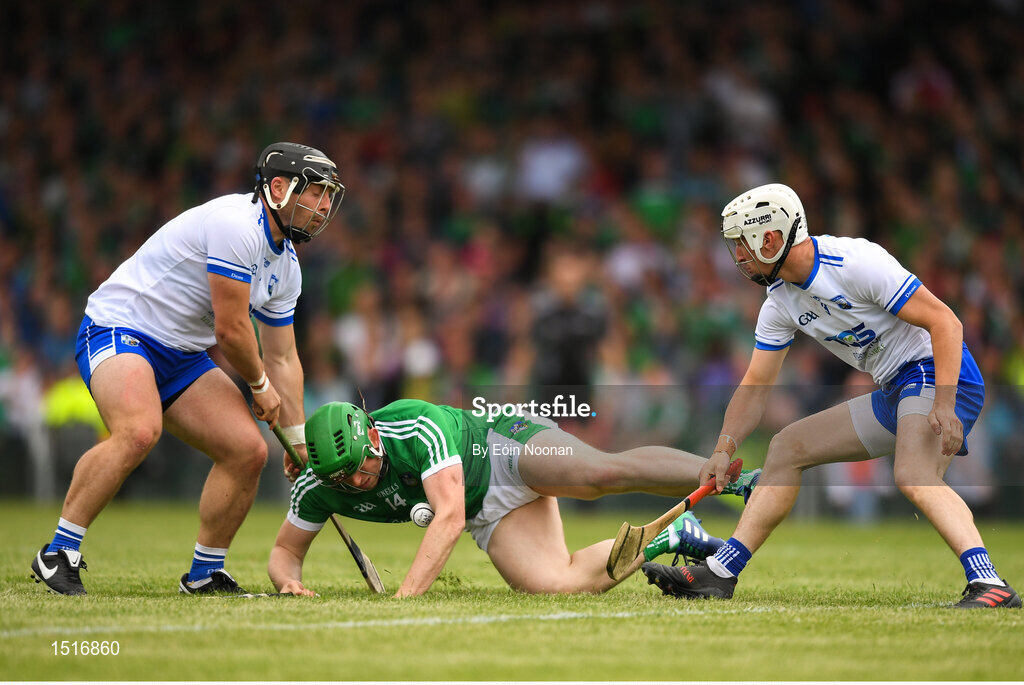 10 June 2018; Shane Dowling of Limerick in action against Noel Connors, left and Shane Fives of Waterford during the Munster GAA Hurling Senior Championship Round 4 match between Limerick and Waterford at the Gaelic Grounds in Limerick. Photo by Eóin Noonan/Sportsfile