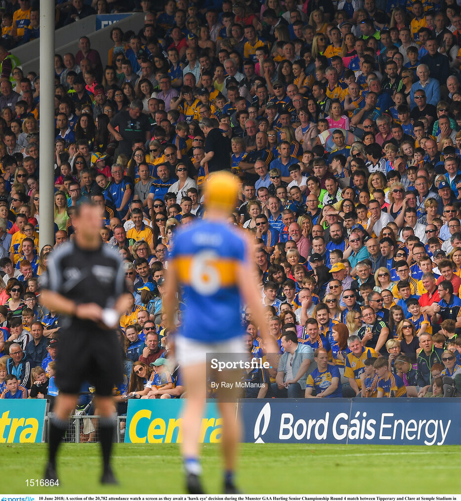 10 June 2018; A section of the 20,782 attendance watch a screen as they await a 'hawk eye' decision during the Munster GAA Hurling Senior Championship Round 4 match between Tipperary and Clare at Semple Stadium in Thurles, Tipperary. Photo by Ray McManus/Sportsfile