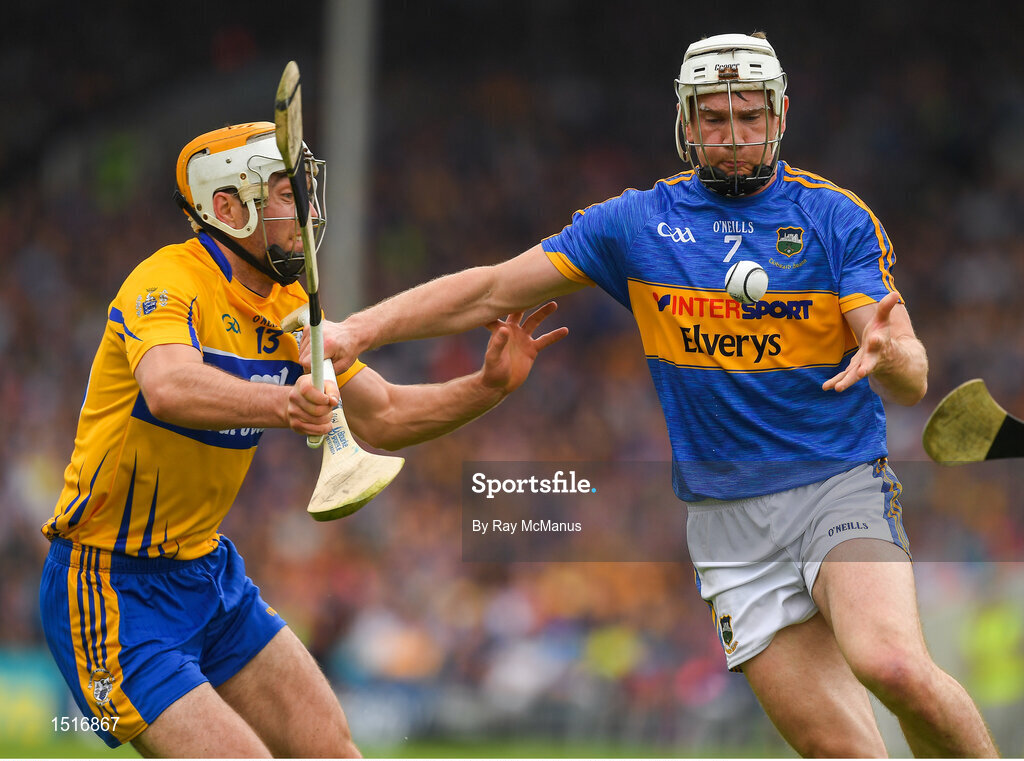 10 June 2018; Brendan Maher of Tipperary in action against Conor McGrath of Clare during the Munster GAA Hurling Senior Championship Round 4 match between Tipperary and Clare at Semple Stadium in Thurles, Tipperary. Photo by Ray McManus/Sportsfile