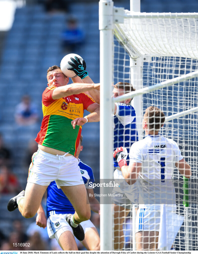 10 June 2018; Mark Timmons of Laois collects the ball on their goal line despite the attention of Darragh Foley of Carlow during the Leinster GAA Football Senior Championship Semi-Final match between Carlow and Laois at Croke Park in Dublin. Photo by Stephen McCarthy/Sportsfile