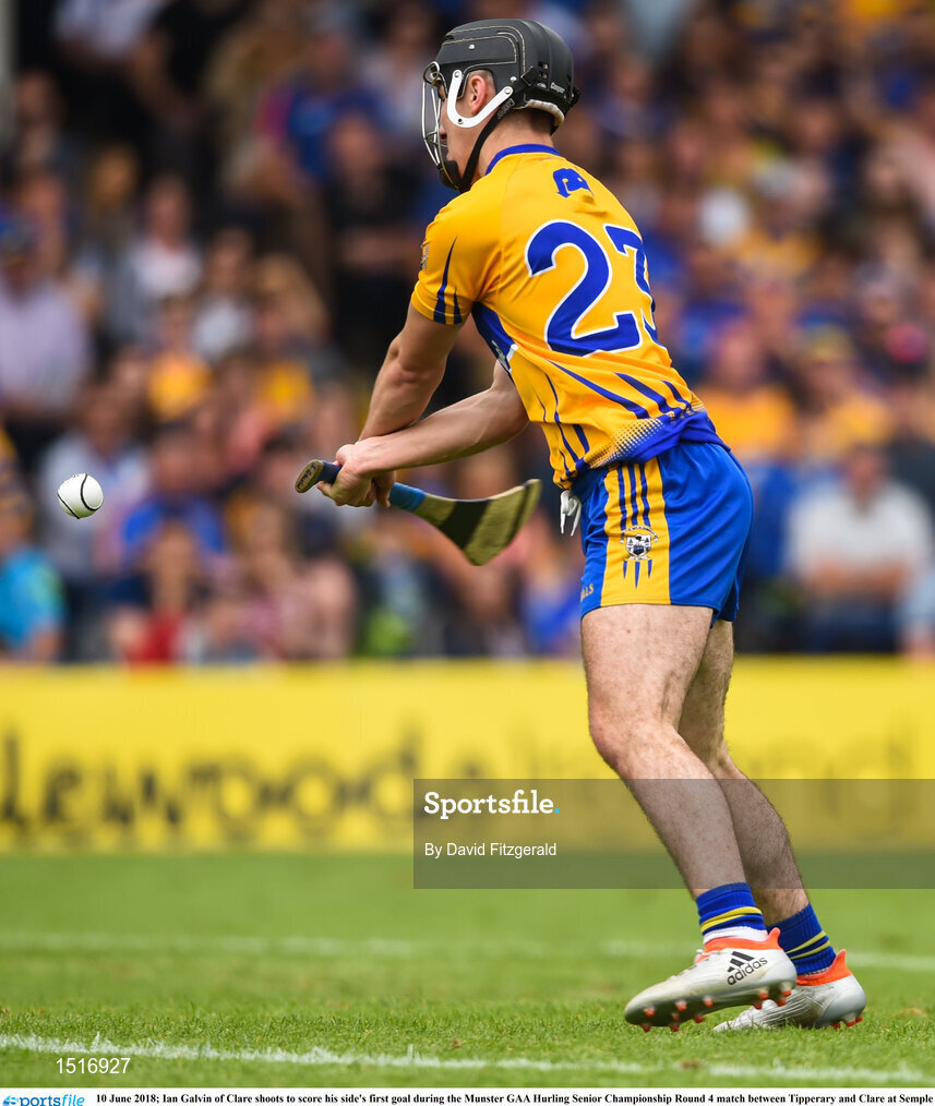 10 June 2018; Ian Galvin of Clare shoots to score his side's first goal during the Munster GAA Hurling Senior Championship Round 4 match between Tipperary and Clare at Semple Stadium in Thurles, Tipperary. Photo by David Fitzgerald/Sportsfile