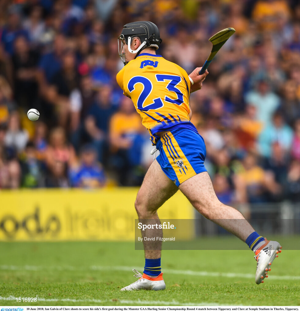 10 June 2018; Ian Galvin of Clare shoots to score his side's first goal during the Munster GAA Hurling Senior Championship Round 4 match between Tipperary and Clare at Semple Stadium in Thurles, Tipperary. Photo by David Fitzgerald/Sportsfile