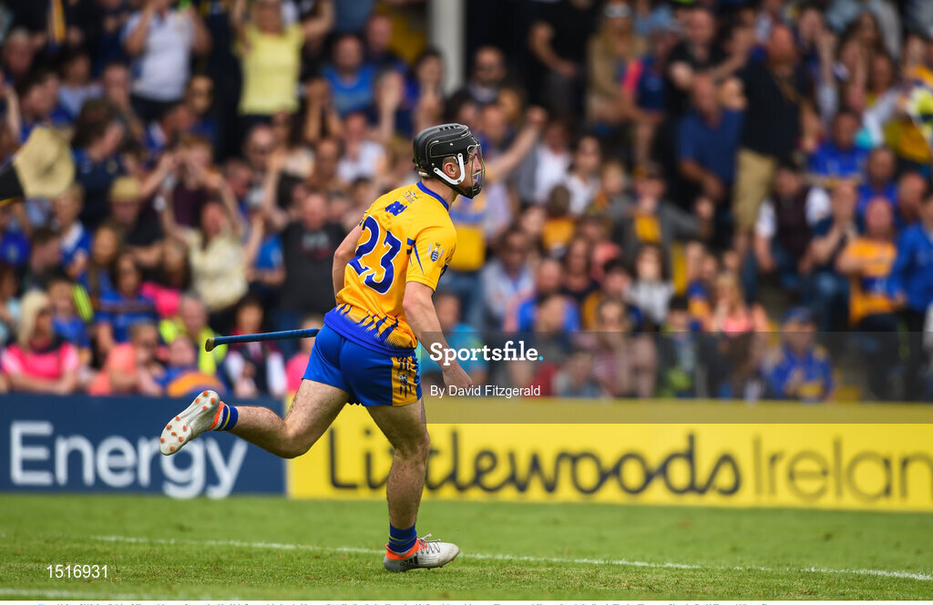 10 June 2018; Ian Galvin of Clare celebrates after scoring his side's first goal during the Munster GAA Hurling Senior Championship Round 4 match between Tipperary and Clare at Semple Stadium in Thurles, Tipperary. Photo by David Fitzgerald/Sportsfile