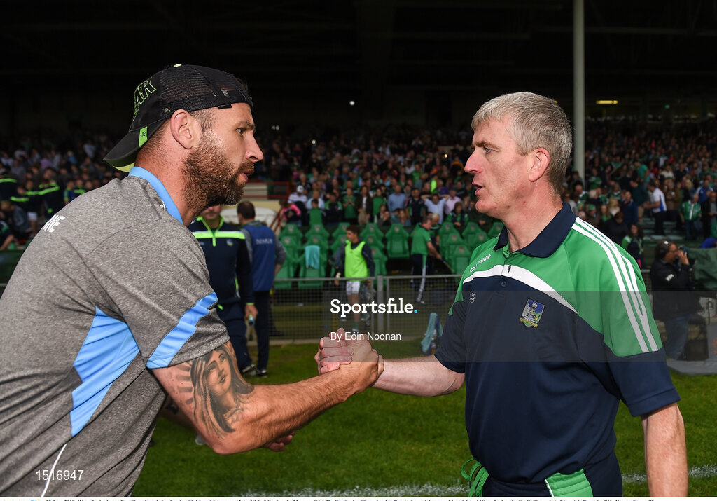 10 June 2018; Waterford selector Dan Shanahan shakes hands with Limerick manager John Kiely following the Munster GAA Hurling Senior Championship Round 4 match between Limerick and Waterford at the Gaelic Grounds in Limerick. Photo by Eóin Noonan/Sportsfile
