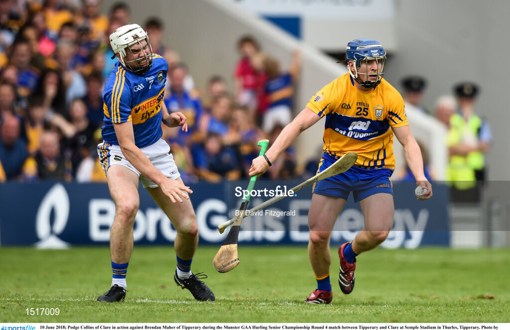 10 June 2018; Podge Collins of Clare in action against Brendan Maher of Tipperary during the Munster GAA Hurling Senior Championship Round 4 match between Tipperary and Clare at Semple Stadium in Thurles, Tipperary. Photo by David Fitzgerald/Sportsfile