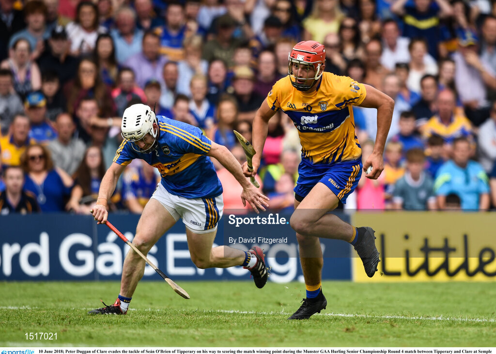 10 June 2018; Peter Duggan of Clare evades the tackle of Seán O'Brien of Tipperary on his way to scoring the match winning point during the Munster GAA Hurling Senior Championship Round 4 match between Tipperary and Clare at Semple Stadium in Thurles, Tipperary. Photo by David Fitzgerald/Sportsfile