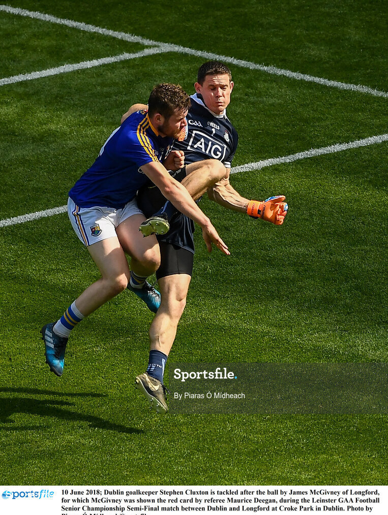 10 June 2018; Dublin goalkeeper Stephen Cluxton is tackled after the ball by James McGivney of Longford, for which McGivney was shown the red card by referee Maurice Deegan, during the Leinster GAA Football Senior Championship Semi-Final match between Dublin and Longford at Croke Park in Dublin. Photo by Piaras Ó Mídheach/Sportsfile