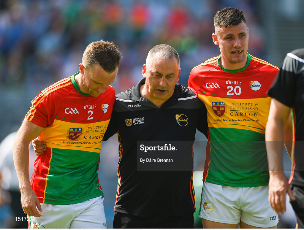 10 June 2018; Carlow manager Turlough O'Brien leaves the field with Chris Crowley, left, and Simon Doyle after the Leinster GAA Football Senior Championship Semi-Final match between Carlow and Laois at Croke Park in Dublin. Photo by Daire Brennan/Sportsfile