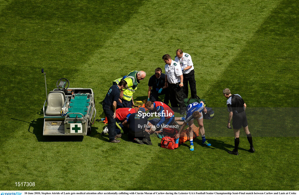 10 June 2018; Stephen Attride of Laois gets medical attention after accidentally colliding with Ciarán Moran of Carlow during the Leinster GAA Football Senior Championship Semi-Final match between Carlow and Laois at Croke Park in Dublin. Photo by Piaras Ó Mídheach/Sportsfile
