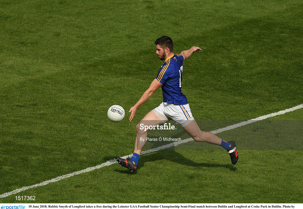 10 June 2018; Robbie Smyth of Longford takes a free during the Leinster GAA Football Senior Championship Semi-Final match between Dublin and Longford at Croke Park in Dublin. Photo by Piaras Ó Mídheach/Sportsfile