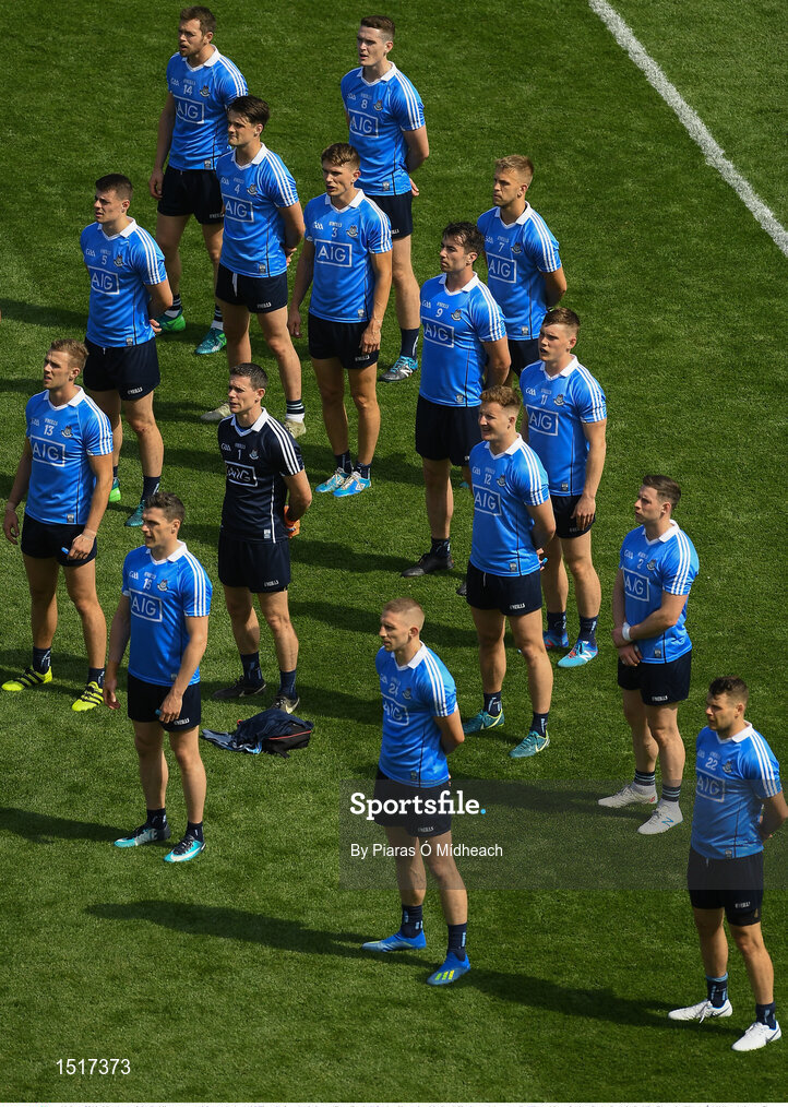 10 June 2018; Members of the Dublin team stand for Amhrán na bhFiann before the Leinster GAA Football Senior Championship Semi-Final match between Dublin and Longford at Croke Park in Dublin. Photo by Piaras Ó Mídheach/Sportsfile