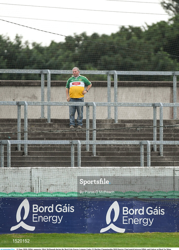 13 June 2018; Offaly supporter Mick McDonagh during the Bord Gáis Energy Leinster Under 21 Hurling Championship 2018 Quarter Final match between Offaly and Galway at Bord Na Móna O'Connor Park, in Tullamore, Offaly. Photo by Piaras Ó Mídheach/Sportsfile