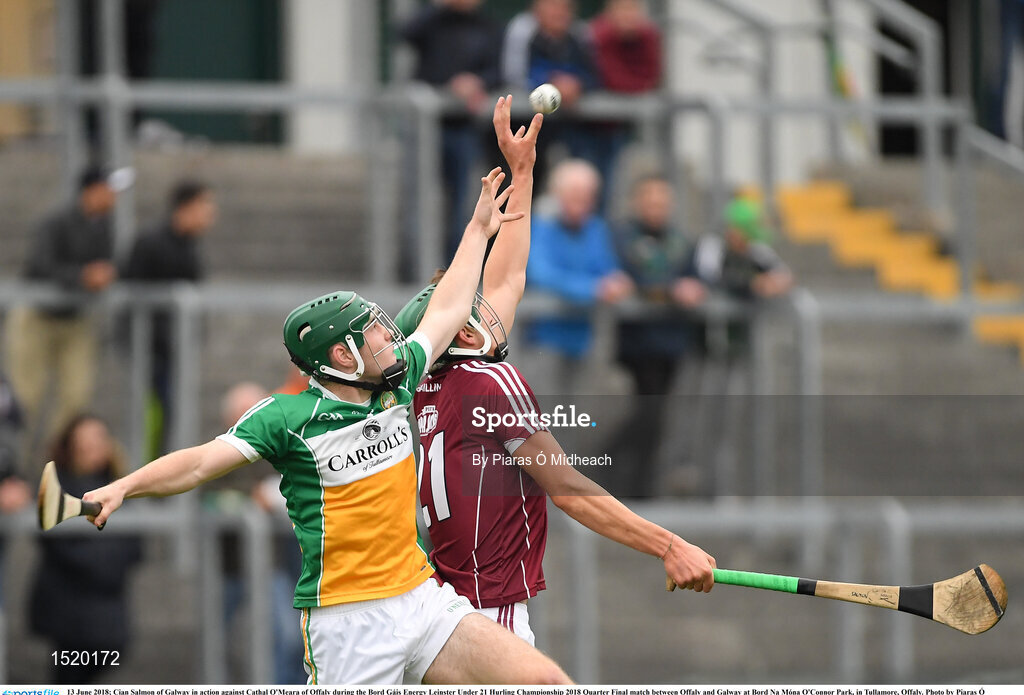 13 June 2018; Cian Salmon of Galway in action against Cathal O'Meara of Offaly during the Bord Gáis Energy Leinster Under 21 Hurling Championship 2018 Quarter Final match between Offaly and Galway at Bord Na Móna O'Connor Park, in Tullamore, Offaly. Photo by Piaras Ó Mídheach/Sportsfile