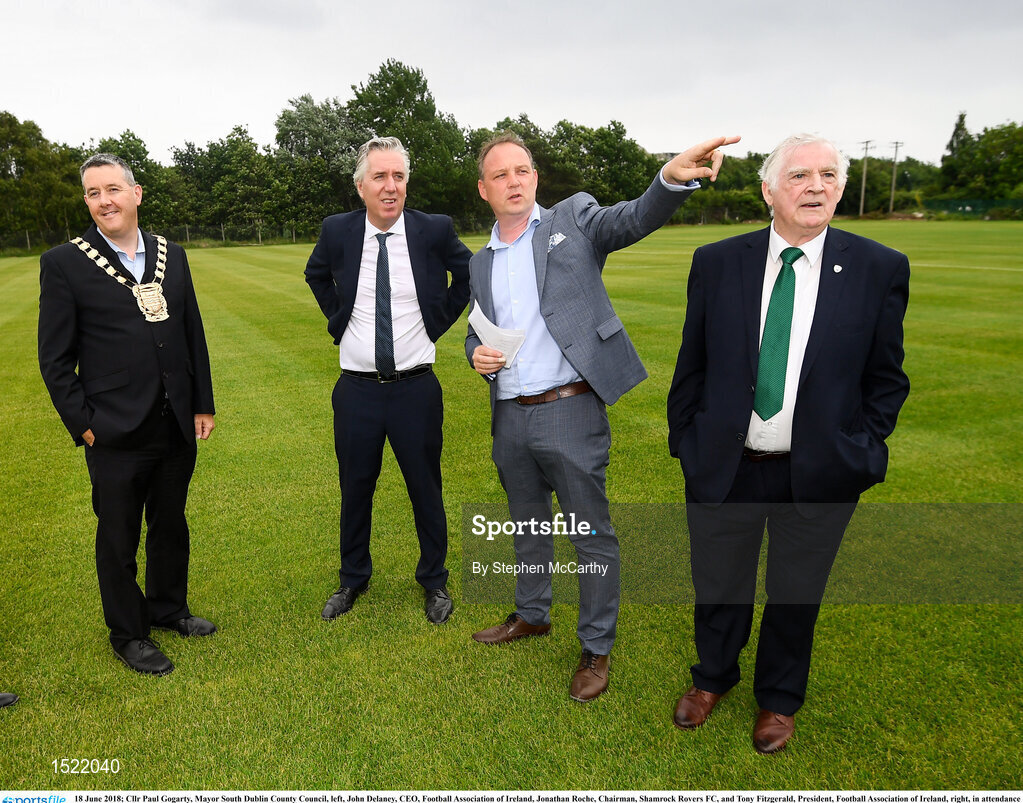 18 June 2018; Cllr Paul Gogarty, Mayor South Dublin County Council, left, John Delaney, CEO, Football Association of Ireland, Jonathan Roche, Chairman, Shamrock Rovers FC, and Tony Fitzgerald, President, Football Association of Ireland, right, in attendance at the official opening of Shamrock Rovers state of the art 11-a-side and 7-a-side grass pitches and facilities at Roadstone Group Sports Club, Kingswood, Dublin. Photo by Stephen McCarthy/Sportsfile