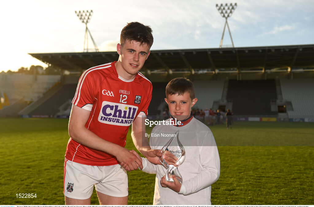 20 June 2018; Presenting Darragh Fitzgibbon of Cork with his Bord Gáis Energy Man of the Match award following the meeting of Cork and Waterford in Pairc Ui Chaoimh is Joey Middleton, age 9, from Crosshaven, Cork. Bord Gáis Energy offers its customers unmissable rewards throughout the Championship season, including match tickets and hospitality, access to training camps with Hurling stars and the opportunity to present Man of the Match Awards at U-21 games. Pairc Ui Chaoimh, Cork. Photo by Eóin Noonan/Sportsfile