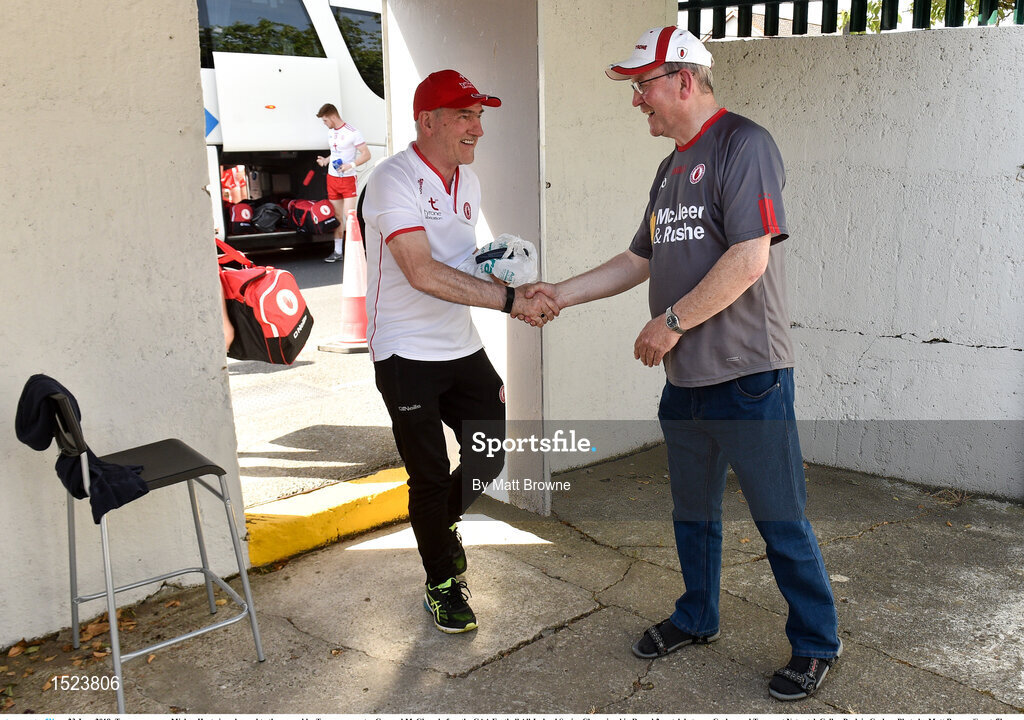 23 June 2018; Tyrone manager Mickey Harte is welcomed to the ground by Tyrone supporter Gerrard McGlynn before the GAA Football All-Ireland Senior Championship Round 2 match between Carlow and Tyrone at Netwatch Cullen Park in Carlow. Photo by Matt Browne/Sportsfile