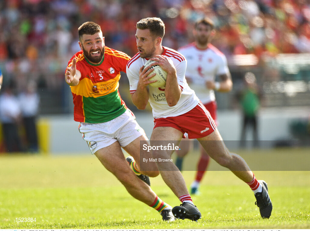 23 June 2018; Niall Sludden of Tyrone in action against Shane Redmond of Carlow during the GAA Football All-Ireland Senior Championship Round 2 match between Carlow and Tyrone at Netwatch Cullen Park in Carlow. Photo by Matt Browne/Sportsfile