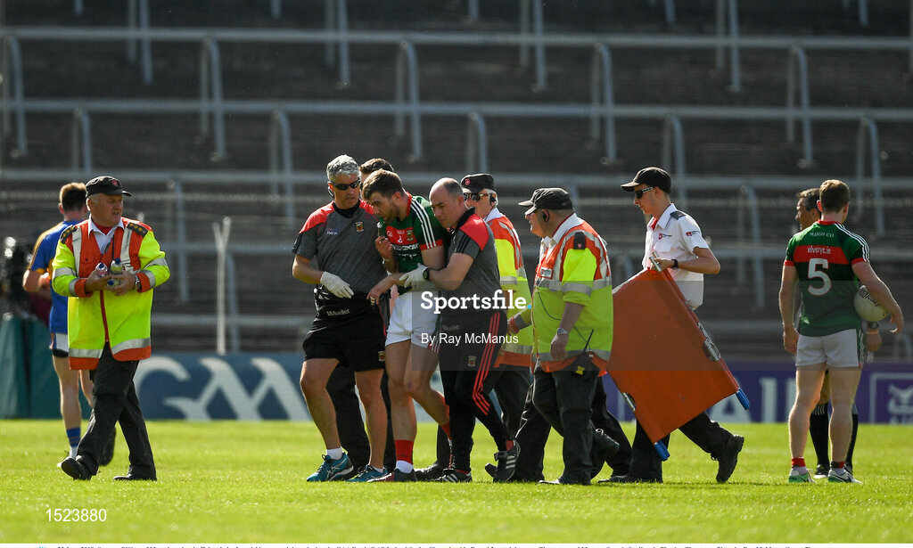 23 June 2018; Seamus O'Shea of Mayo is assisted off the pitch after picking up an injury during the GAA Football All-Ireland Senior Championship Round 2 match between Tipperary and Mayo at Semple Stadium in Thurles, Tipperary. Photo by Ray McManus/Sportsfile