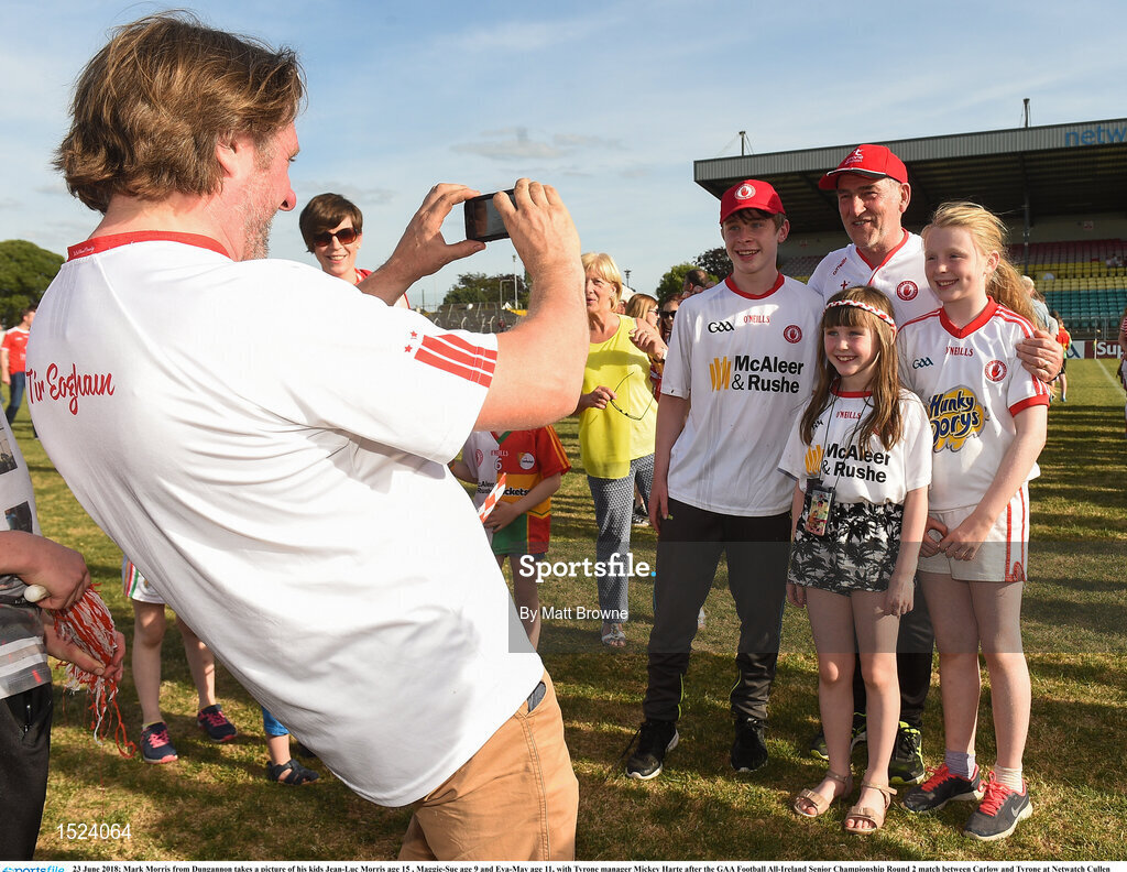 23 June 2018; Mark Morris from Dungannon takes a picture of his kids Jean-Luc Morris age 15 , Maggie-Sue age 9 and Eva-May age 11, with Tyrone manager Mickey Harte after the GAA Football All-Ireland Senior Championship Round 2 match between Carlow and Tyrone at Netwatch Cullen Park in Carlow. Photo by Matt Browne/Sportsfile