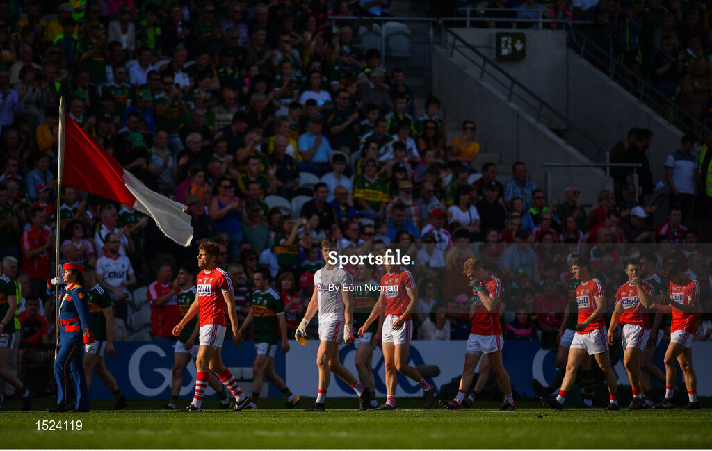 23 June 2018; Ian Maguire of Cork leads his side around during the parade prior to the Munster GAA Football Senior Championship Final match between Cork and Kerry at Páirc Ui Chaoimh in Cork. Photo by Eóin Noonan/Sportsfile