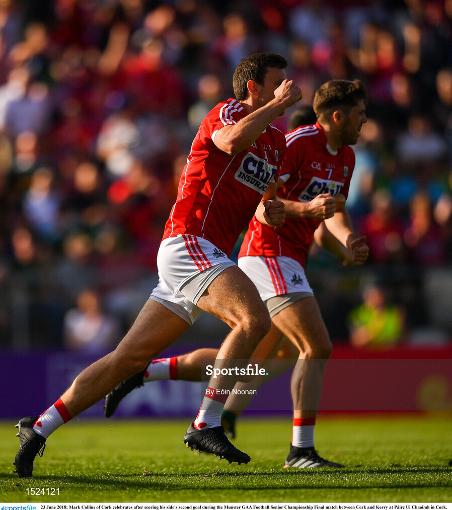 23 June 2018; Mark Collins of Cork celebrates after scoring his side's second goal during the Munster GAA Football Senior Championship Final match between Cork and Kerry at Páirc Ui Chaoimh in Cork. Photo by Eóin Noonan/Sportsfile