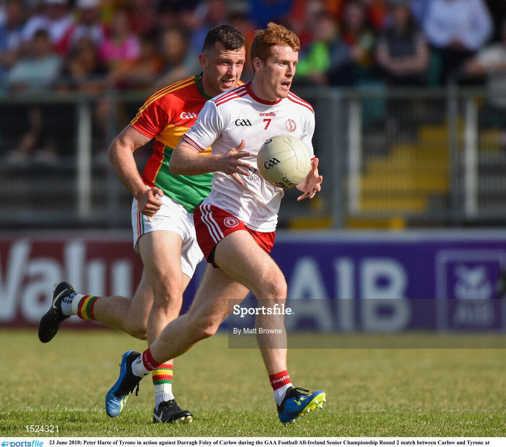 23 June 2018; Peter Harte of Tyrone in action against Darragh Foley of Carlow during the GAA Football All-Ireland Senior Championship Round 2 match between Carlow and Tyrone at Netwatch Cullen Park in Carlow. Photo by Matt Browne/Sportsfile