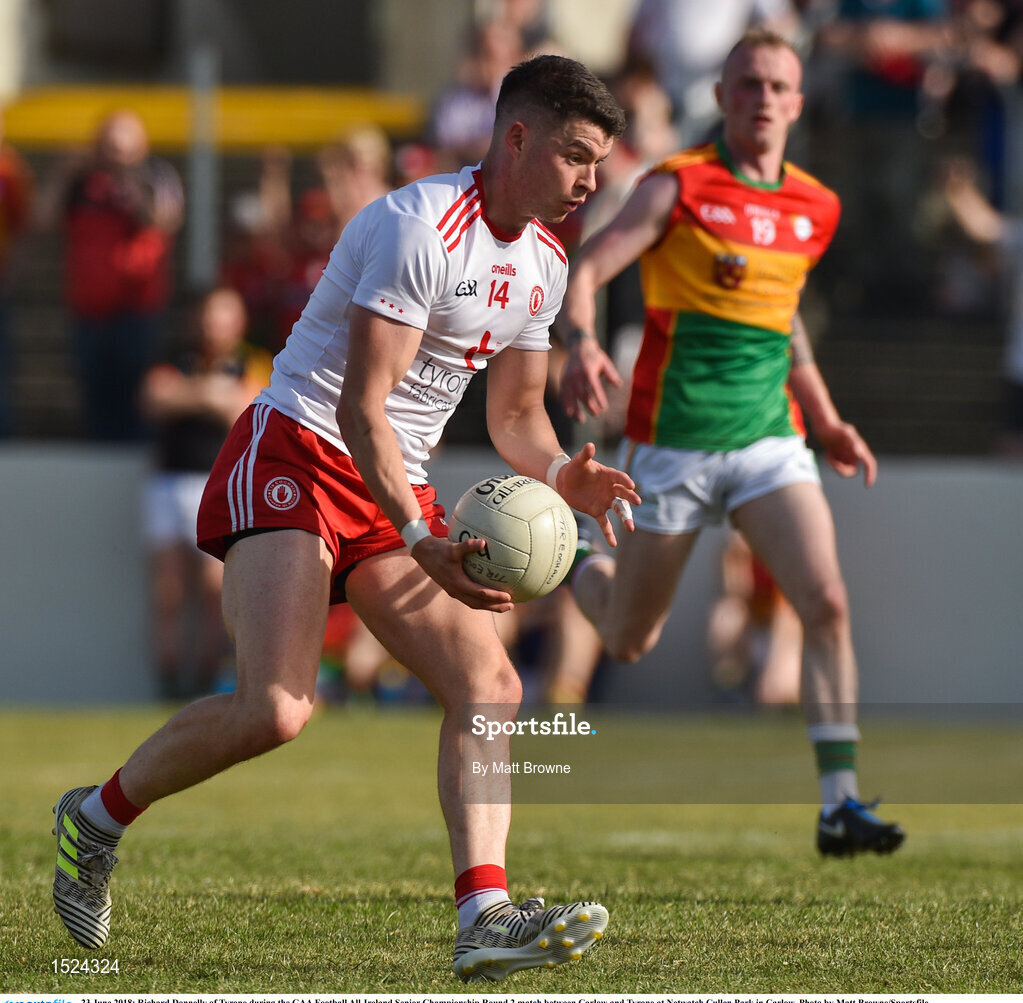 23 June 2018; Richard Donnelly of Tyrone during the GAA Football All-Ireland Senior Championship Round 2 match between Carlow and Tyrone at Netwatch Cullen Park in Carlow. Photo by Matt Browne/Sportsfile