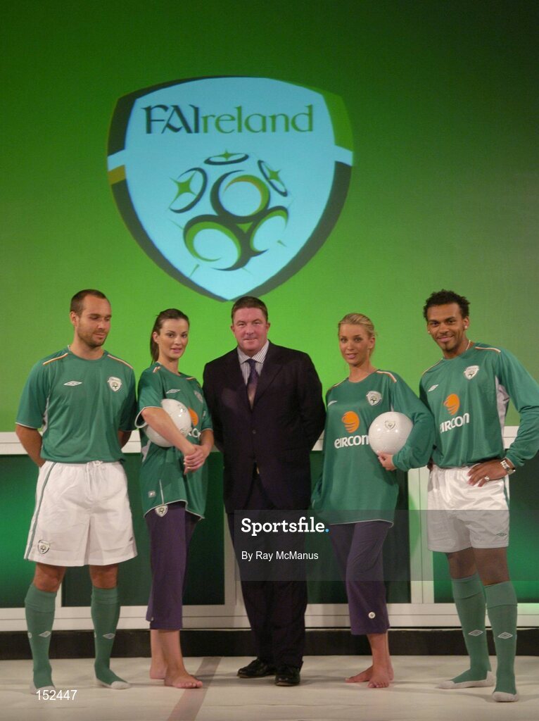 25 August 2004; Fran Rooney, CEO, FAI, with models left to right, Justin Manville, Karen Fitzpatrick, Katy French and Emy Onyesoh at the launch of the Association's new logo, website, fans club and range of merchandise in Jury's Hotel, Dublin. Picture credit; Ray McManus / SPORTSFILE