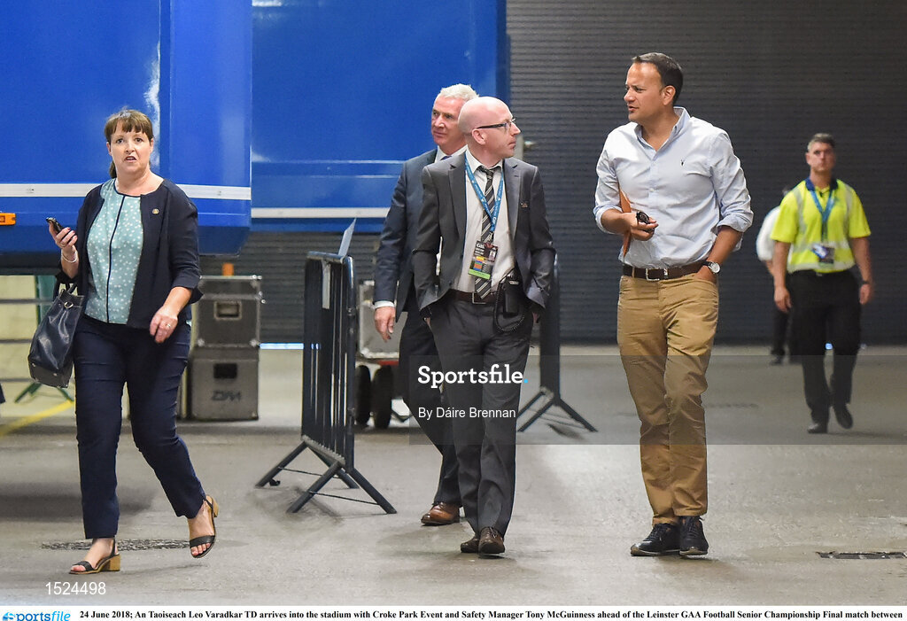 24 June 2018; An Taoiseach Leo Varadkar, T.D., arrives into the stadium with Croke Park Event and Safety Manager Tony McGuinness ahead of the Leinster GAA Football Senior Championship Final match between Dublin and Laois at Croke Park in Dublin. Photo by Daire Brennan/Sportsfile