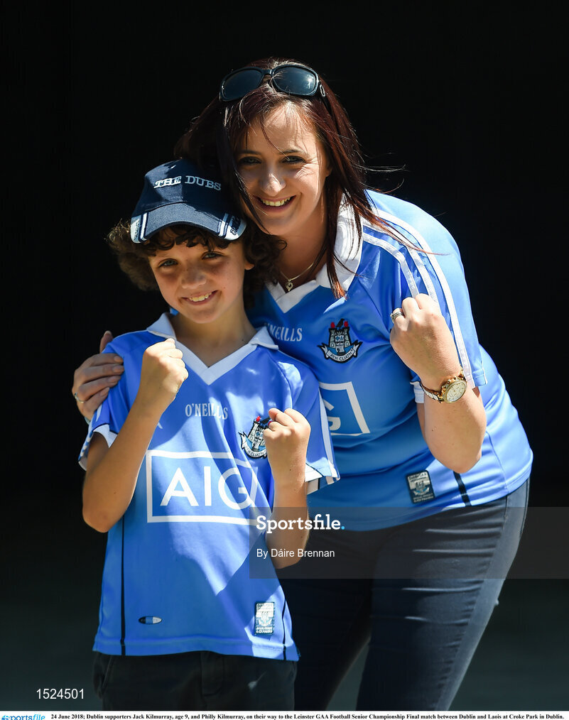 24 June 2018; Dublin supporters Jack Kilmurray, age 9, and Philly Kilmurray, on their way to the Leinster GAA Football Senior Championship Final match between Dublin and Laois at Croke Park in Dublin. Photo by Daire Brennan/Sportsfile