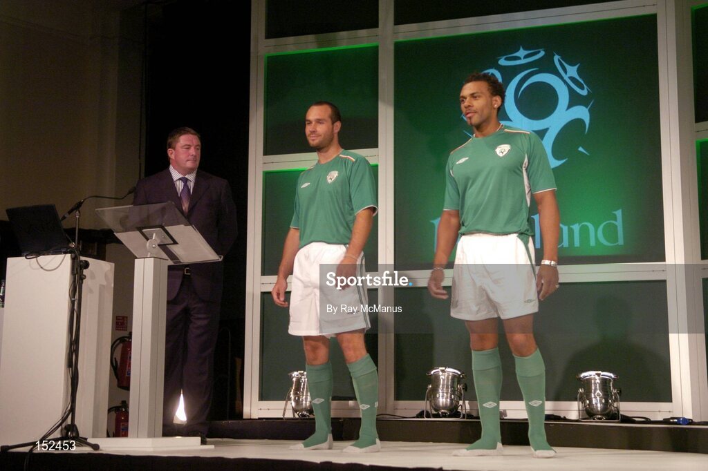 25 August 2004; Models Justin Manville, left, and Emy Onyesoh show off the new replica kit under the watchful eye of Fran Rooney, CEO, FAI, at the launch of the Association's new logo, website, fans club and range of merchandise in Jury's Hotel, Dublin. Picture credit; Ray McManus / SPORTSFILE