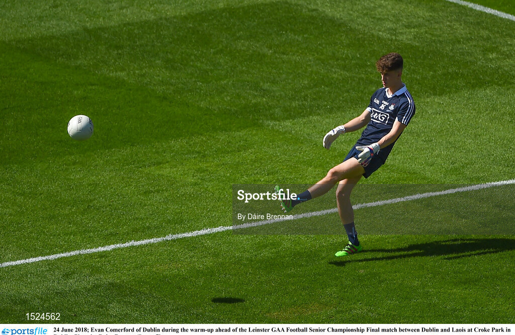 24 June 2018; Evan Comerford of Dublin during the warm-up ahead of the Leinster GAA Football Senior Championship Final match between Dublin and Laois at Croke Park in Dublin. Photo by Daire Brennan/Sportsfile