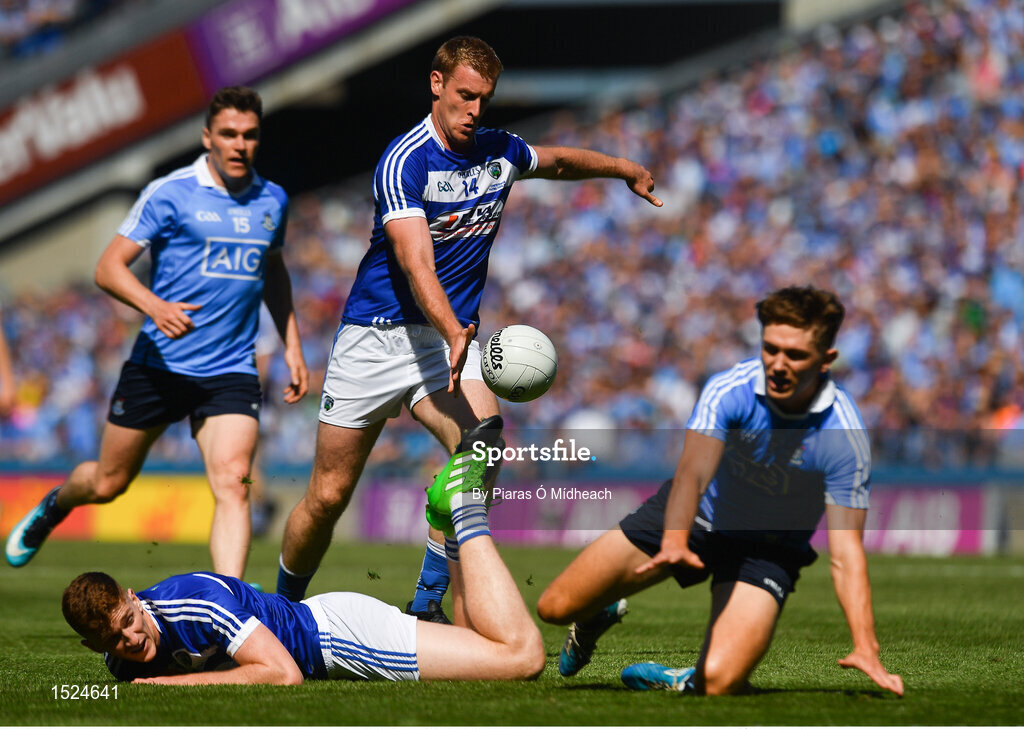 24 June 2018; Donal Kingston of Laois scores a first half point as Evan O'Carroll of Laois and Michael Fitzsimons of Dublin look on during the Leinster GAA Football Senior Championship Final match between Dublin and Laois at Croke Park in Dublin. Photo by Piaras Ó Mídheach/Sportsfile