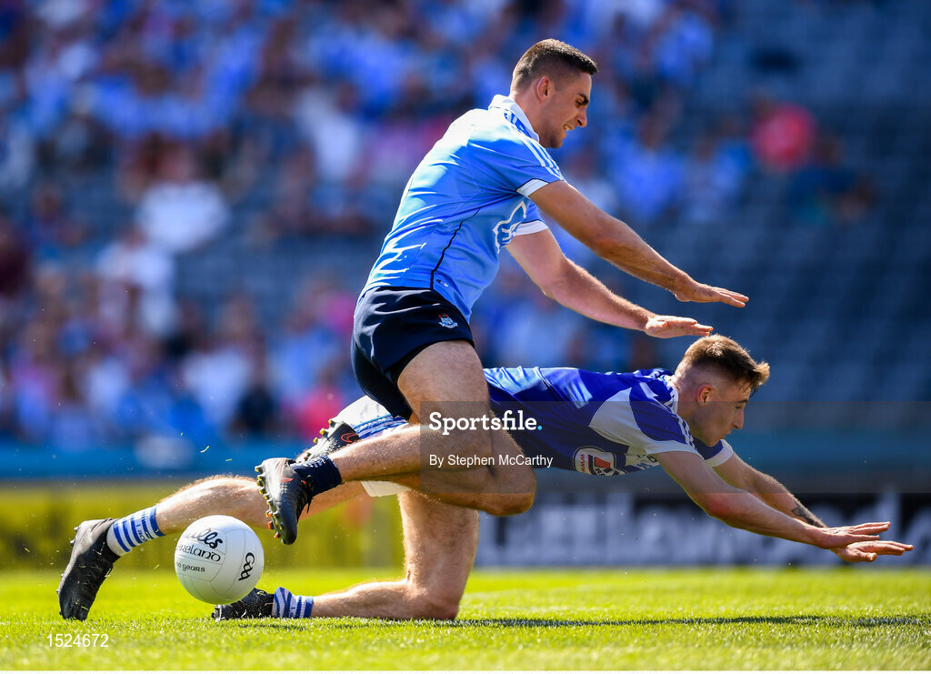 24 June 2018; James McCarthy of Dublin has his shot blocked by Trevor Collins of Laois during the Leinster GAA Football Senior Championship Final match between Dublin and Laois at Croke Park in Dublin. Photo by Stephen McCarthy/Sportsfile