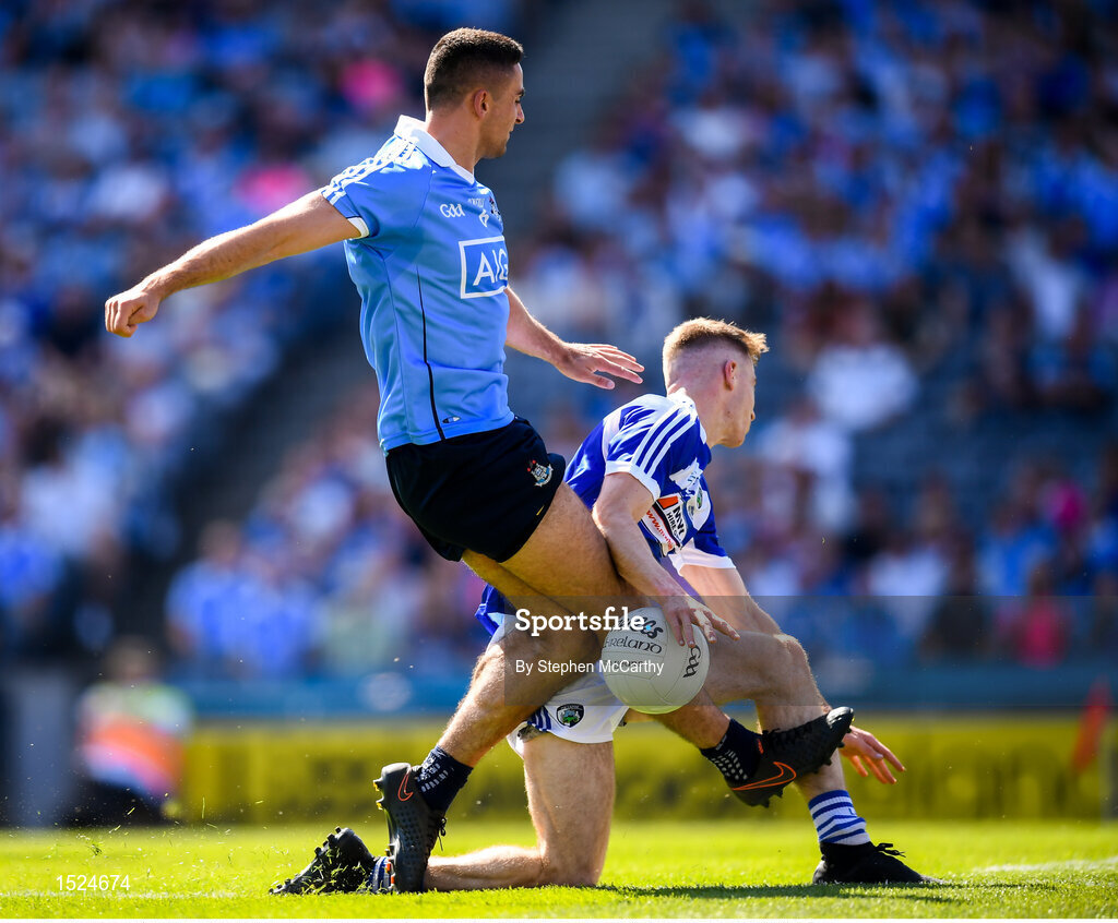 24 June 2018; James McCarthy of Dublin has his shot blocked by Trevor Collins of Laois during the Leinster GAA Football Senior Championship Final match between Dublin and Laois at Croke Park in Dublin. Photo by Stephen McCarthy/Sportsfile