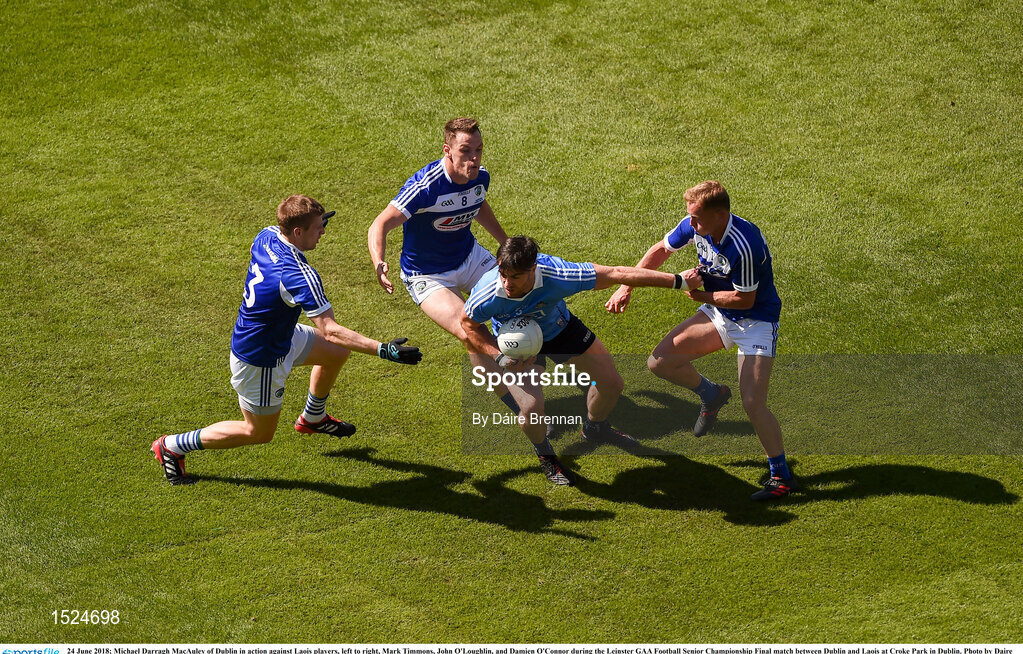 24 June 2018; Michael Darragh MacAuley of Dublin in action against Laois players, left to right, Mark Timmons, John O'Loughlin, and Damien O'Connor during the Leinster GAA Football Senior Championship Final match between Dublin and Laois at Croke Park in Dublin. Photo by Daire Brennan/Sportsfile