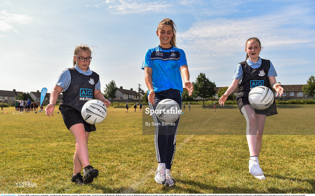 27 June 2018; Aoife Kane of Dublin, and Bronagh Redmond, aged 12, and Kim Ellis, aged 12, from St Raphaels, Ballyfermot, were in Ballyfermot Sports Complex today at the AIG Heroes event, an initiative which helps support local grassroots communities by partnering with Dublin GAA and others to use sport as a means to build self-confidence and social skills in young kids. To further promote these efforts AIG Insurance gifted GAA equipment to primary schools in the area. Photo by Sam Barnes/Sportsfile