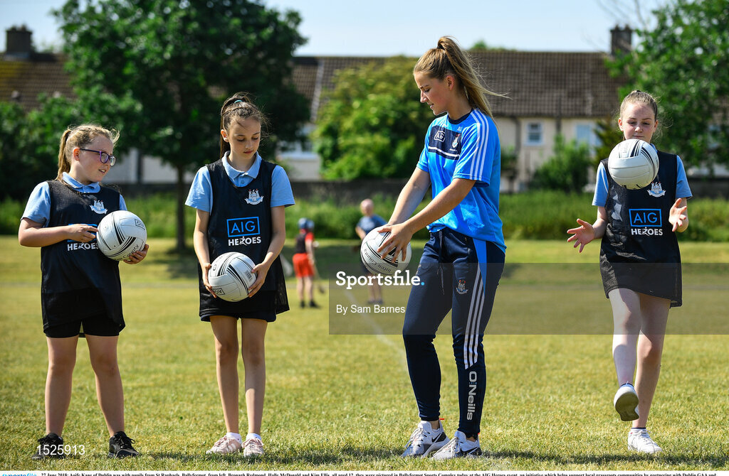 27 June 2018; Aoife Kane of Dublin was with pupils from St Raphaels, Ballyfermot, from left, Bronagh Redmond, Halle McDonald and Kim Ellis, all aged 12, they were pictured in Ballyfermot Sports Complex today at the AIG Heroes event, an initiative which helps support local grassroots communities by partnering with Dublin GAA and others to use sport as a means to build self-confidence and social skills in young kids. To further promote these efforts AIG Insurance gifted GAA equipment to primary schools in the area. Photo by Sam Barnes/Sportsfile